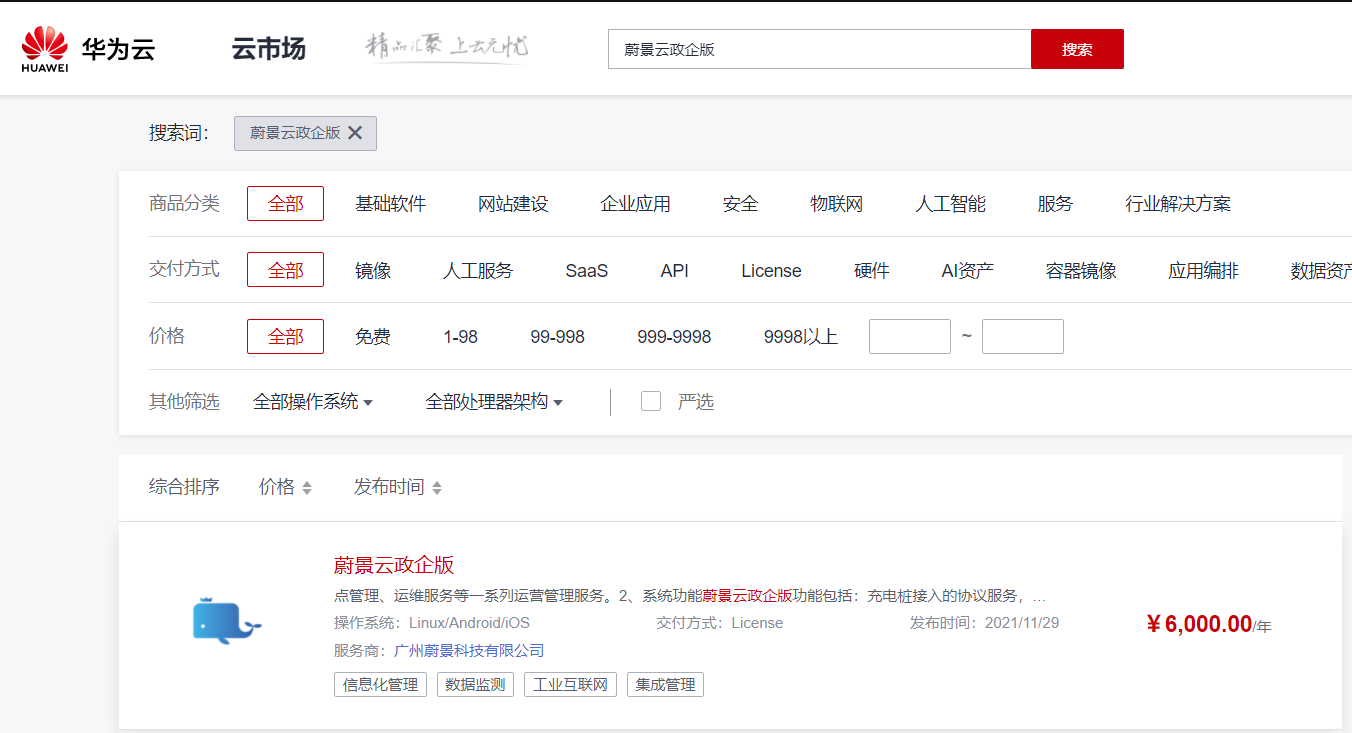 本次合作的达成,标志着以华为云为代表的头部企业对蔚景云平台服务能力的高度认可及技术实力的充分信赖。 在华为云市场的产品实施服务中,除了常规版本外,还可以购买和体验“专用云、政企集团版、城市监管平台、城市运营平台”等产品服务。截至2021年11月,平台服务6000+充电站、7000+万度充电量、30000+直连平台充电资源。 未来,蔚景云在持续推动与华为云深度合作的同时,也将更好地发挥自身优势,持续践行以开发者为中心的战略部署和产品矩阵升级,不断赋能运营商、桩企,助力其实现更高质量的运营,更持续性的增长及更高效的盈利,通过携手更多合作伙伴,构建更加广阔的新能源产业生态圈。 《下单流程指引》 一、官方渠道购买 进入华为云市场官网(https://activity.huaweicloud.com/) 点击云市场 选择产业生态市场 物联网 输入蔚景云 立即购买 |